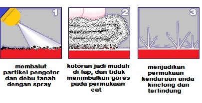 Bisa digunakan langsung pada permukaan cat yang terkotori debu, karena isinya yang bisa mengangkat kotoran dari permukaan cat, melapnya, tanpa menimbulkan goresan pada cat. Akibatnya apa? tentu saja menghemat pemakaian air dalam memelihara kendaraan. Agar bisa memahami kemampuan ini, marilah kita perhatikan proses bekerjanya pengkilap mobil ini.